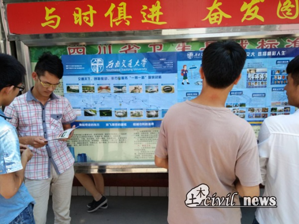 海报张贴完毕,引来了众多冕宁中学学子。他们走近海报的同时,志愿者们递给他们交大宣传手册,对交大进行了简单的介绍。交大的优势学科有土木、机械、电气、交运、信息、测绘等,志愿者们提到交大土木在今年还增加了两个专业。此外,志愿者们还对交大的杰出校友、交大的双严传统等进行了简单介绍。