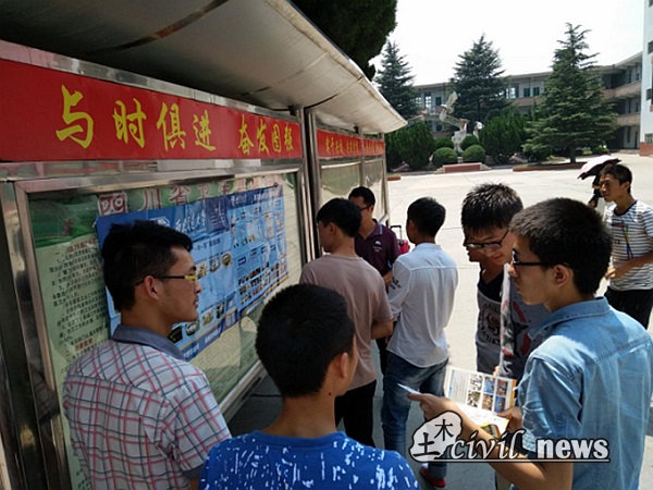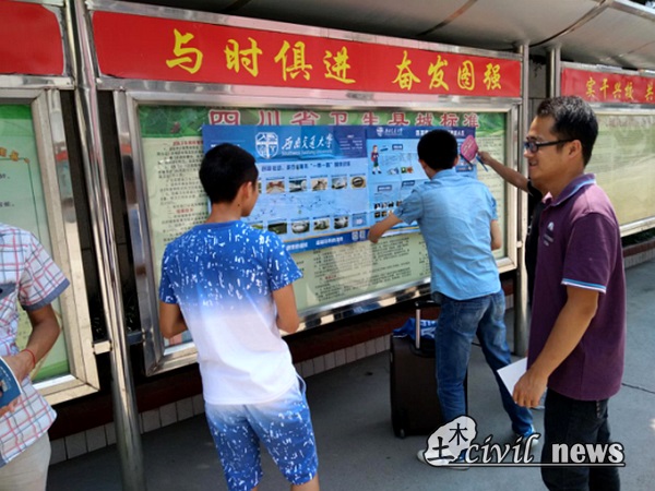 上午10点,志愿者们来到了冕宁县冕宁中学,首先和学校相关负责人和安保人员进行了简单沟通,并获准在校内进行宣传。志愿者们随后将交大宣传海报张贴于宣传栏上。